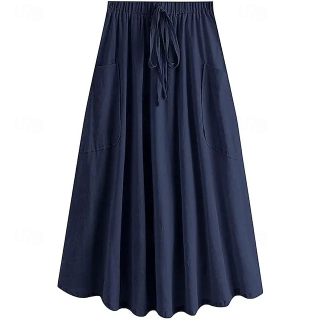 Women’s Skirt Swing Midi Cotton Linen Wine Black Army Green Sky Blue Skirts Summer Pocket Drawstring High Waist Basic Casual Casual Daily Weekend XS S M