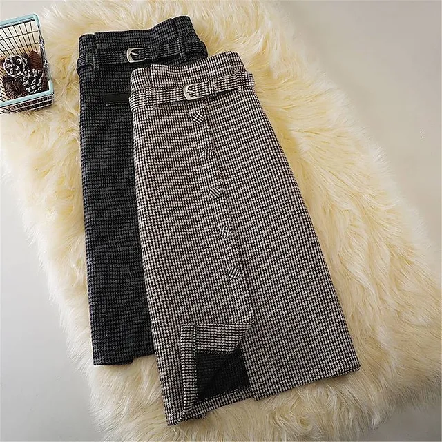 Women’s Skirt A Line Maxi Tweed Black Khaki Button Skirts Fall & Winter Patchwork Belt Included Fashion Elegant Street Daily M L XL