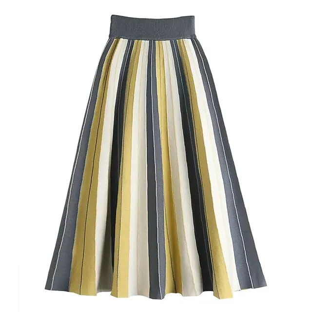 Women’s Pleated Midi Knit Striped Skirt Dark Red Yellow Blue Orange Skirts Fall & Winter Pleated Knitting Long Fashion Elegant Daily Holiday S M L