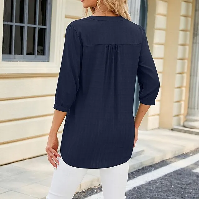 Shirt Blouse Women’s Black Pink Navy Blue Solid Color Button Street Daily Fashion V Neck S