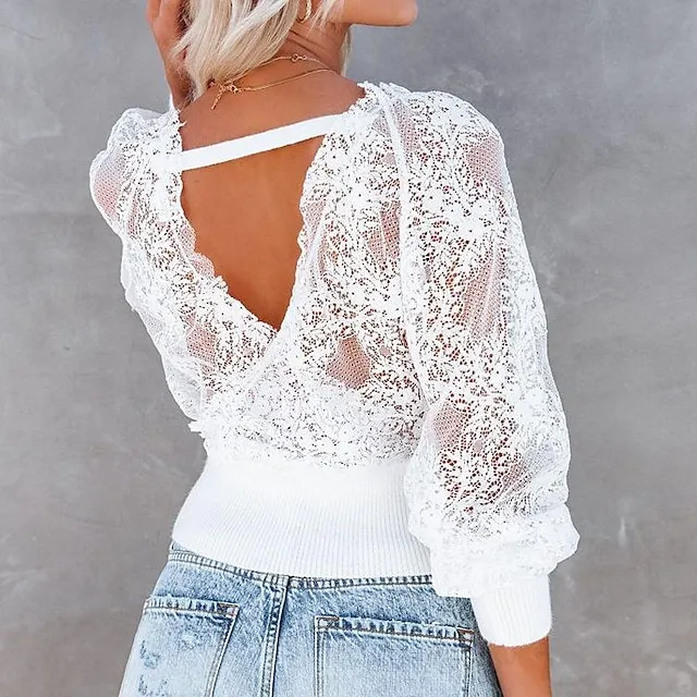 Shirt Blouse Women’s Black White Solid Color Lace Street Daily Fashion V Neck S