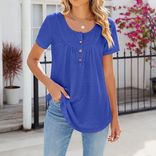 T shirt Tee Women’s Black Pink Blue Solid Color Button Street Daily Fashion Round Neck S
