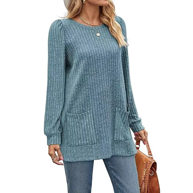 Shirt Blouse Women’s Black Wine Blue Solid / Plain Color Pocket Daily Fashion Round Neck Regular Fit S