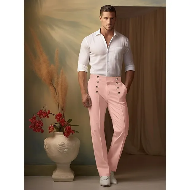 40% Linen Men’s Linen Pants Trousers Summer Pants Button Pocket Straight Leg Plain Breathable Comfortable Office / Career Daily Vacation Classic Casual Black White