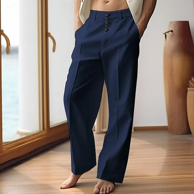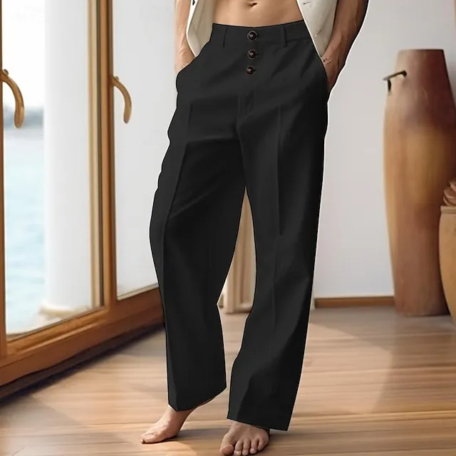 40% Linen Men’s Linen Pants Trousers Summer Pants Button Pocket Straight Leg Plain Breathable Comfortable Office / Career Daily Vacation Classic Casual Black White