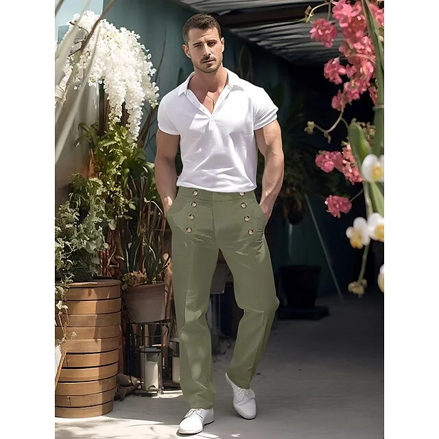40% Linen Men’s Linen Pants Trousers Summer Pants Button Pocket Straight Leg Plain Breathable Comfortable Office / Career Daily Vacation Classic Casual Black White