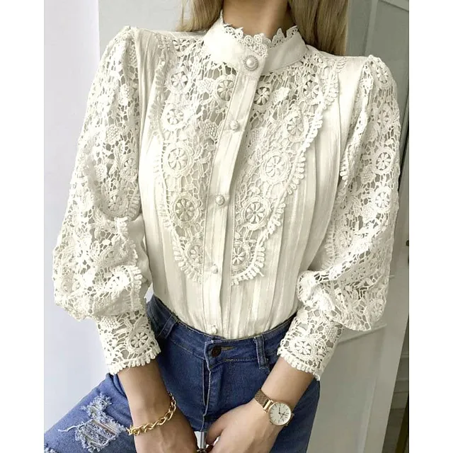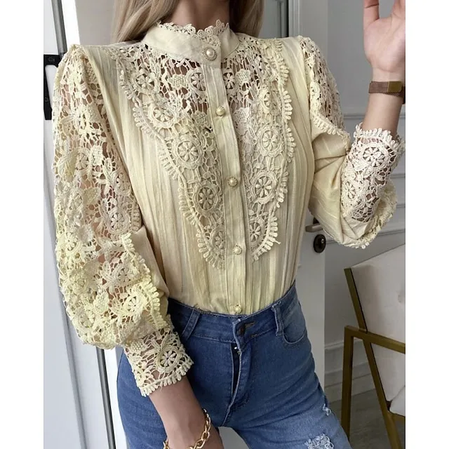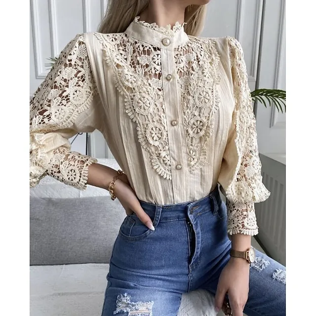 Women’s Lace Shirt Shirt Blouse Turtleneck shirt Plain Daily Weekend Black White Beige Lace Button Cut Out Long Sleeve Elegant Vintage Fashion Standing Collar Regular Fit Spring Fall