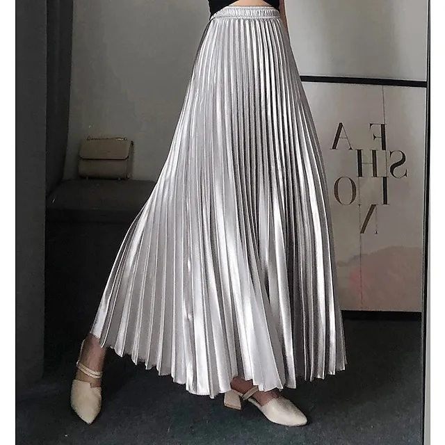 Women’s Swing Long Skirt Midi Polyester Gold Velvet Black White Silver Champagne Skirts Spring & Summer Pleated Without Lining Elegant Fashion Casual Office / Career Street M L XL