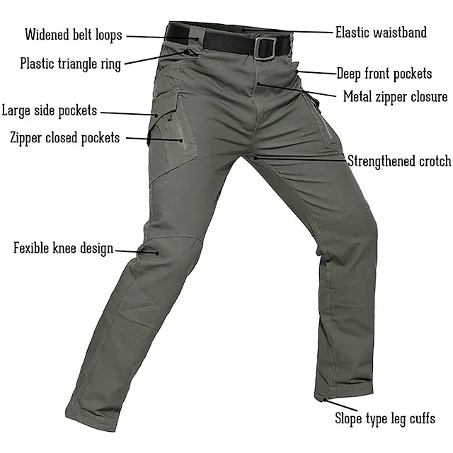 – Designed specifically for men, these multi-pocket tactical pants offer a military and work-appropriate style that includes quick-dry and zipper pocket features.