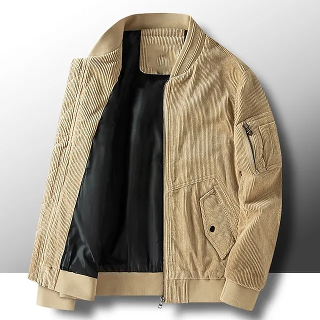 Men’s Corduroy Jacket Varsity Jacket Outdoor Daily Wear Warm Zipper Pocket Fall Winter Plain Fashion Streetwear Standing Collar Regular Light Sky Blue Black khaki Jacket
