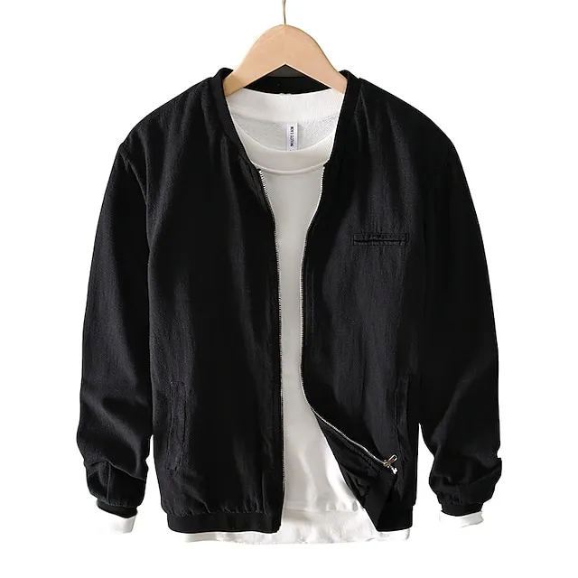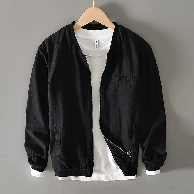 Men’s Linen Jacket Daily Wear Vacation Durable Casual / Daily Pocket Spring & Fall Plain Comfort Leisure Standing Collar Regular Black White Green khaki Gray Jacket