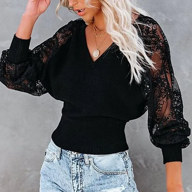 Shirt Blouse Women’s Black White Solid Color Lace Street Daily Fashion V Neck S