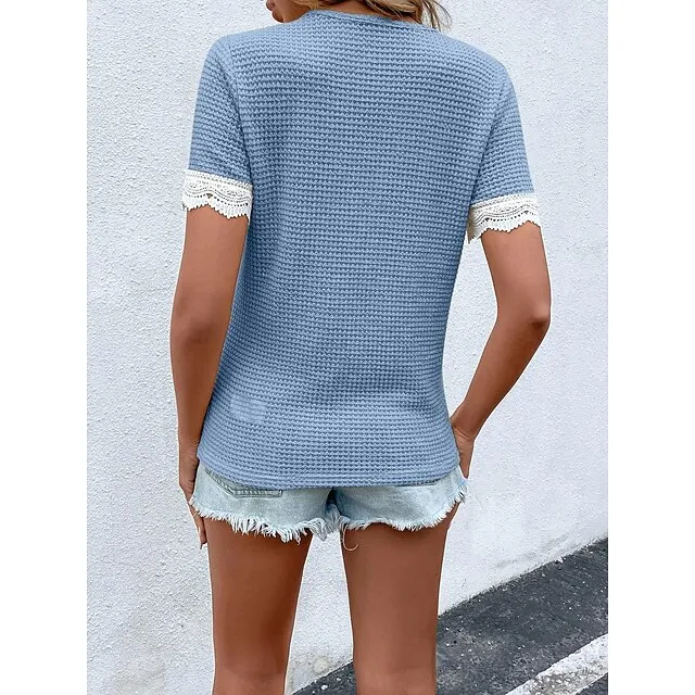 Shirt Blouse Women’s Blue Beige Solid Color Lace Button Street Daily Fashion V Neck S