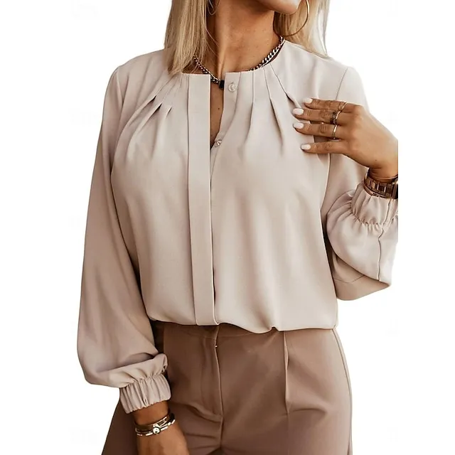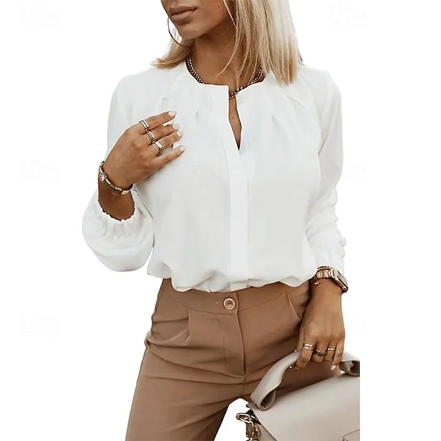 Shirt Blouse Women’s White Blue Green Solid Color Ruched Street Daily Fashion Round Neck S