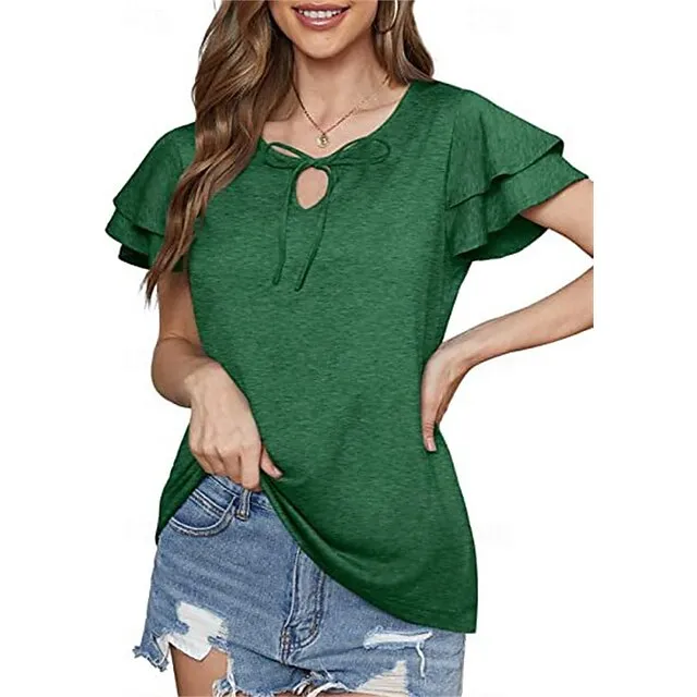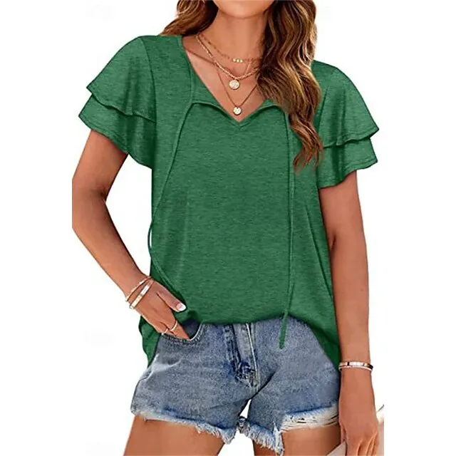 T shirt Tee Women’s Black Pink Blue Solid Color Lace up Ruffle Street Daily Fashion V Neck S
