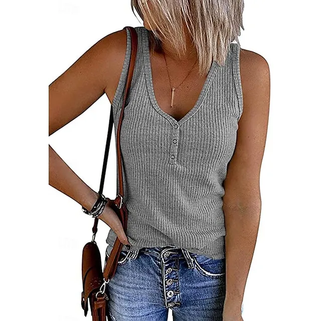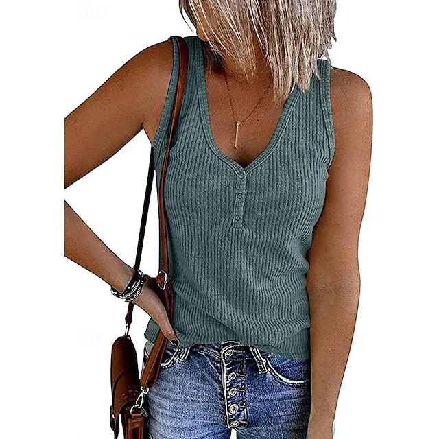 Tank Women’s Black Wine Navy Blue Solid Color Button Street Daily Fashion V Neck S