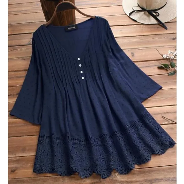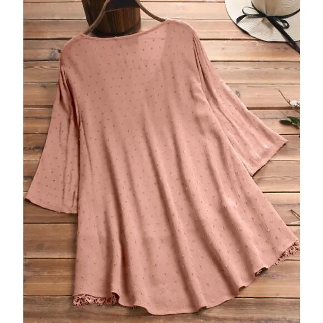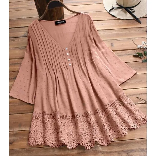 Women’s Lace Shirt Shirt Blouse White Eyelet Tops Cotton Pure Color Daily White Pink Green Lace Button 3/4 Length Sleeve Basic Casual V Neck Regular Fit Summer Spring Fall