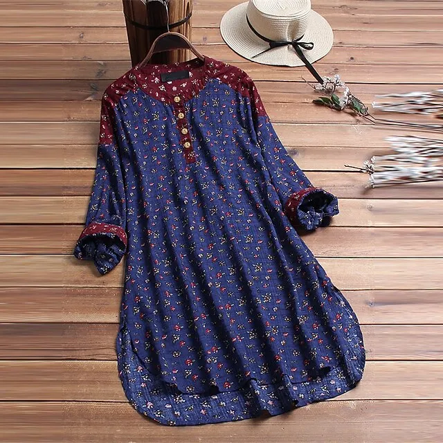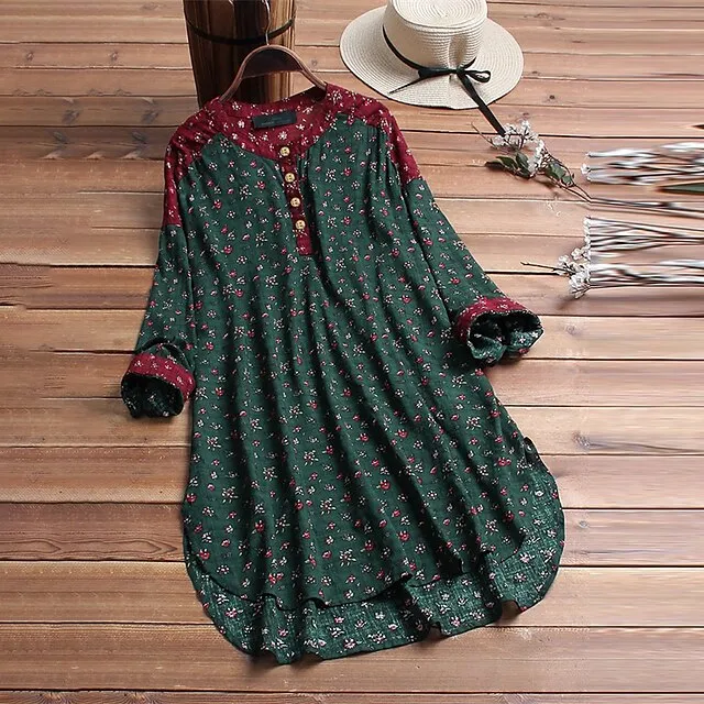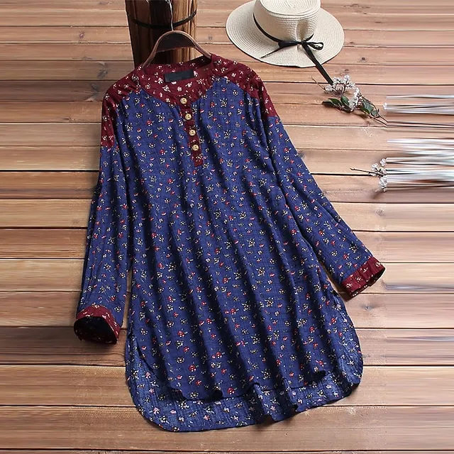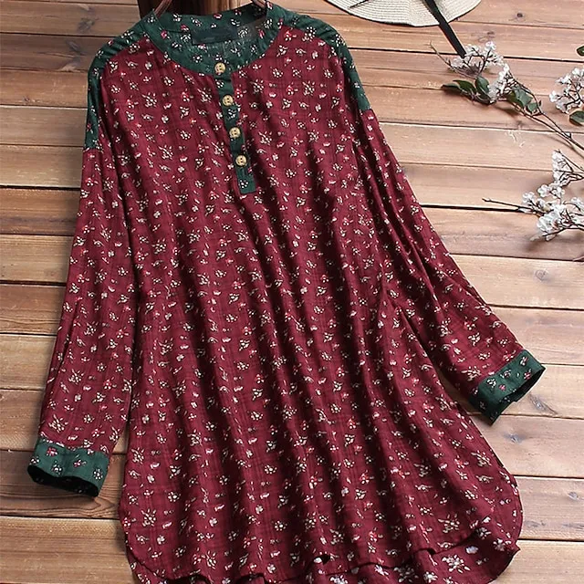 Women’s Plus Size Shirt Blouse Cotton Floral Graphic Daily Vacation Weekend Red Blue Green Print Long Sleeve Holiday Casual Crew Neck Regular Fit Spring Fall Winter