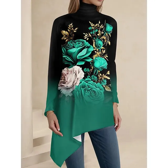 Women's T shirt Tee Floral Holiday Weekend Black Print Asymmetrical Long Sleeve Fashion Turtleneck High Neck Regular Fit Spring & Fall
