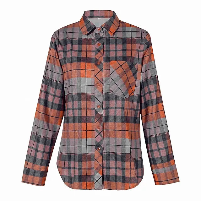 Women’s Shirt Blouse Plaid Casual Orange Gray Print Button Pocket Long Sleeve Fashion Shirt Collar Regular Fit Spring & Fall