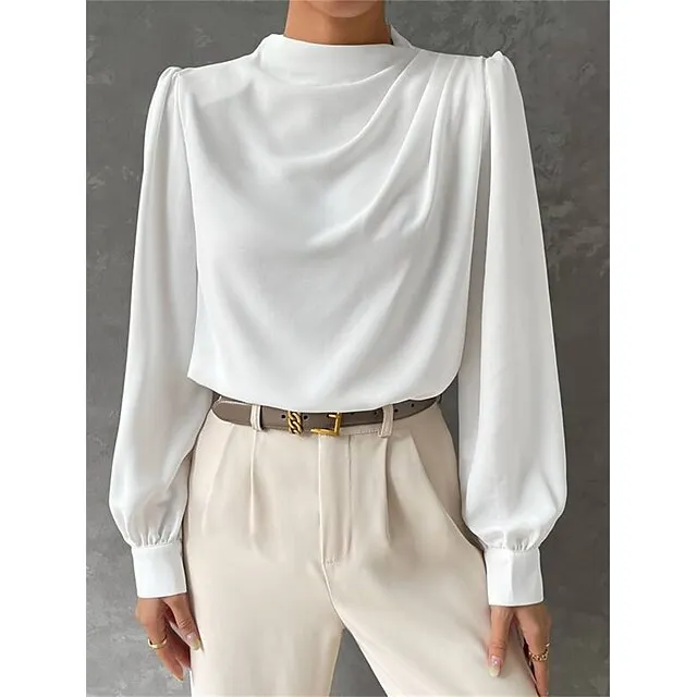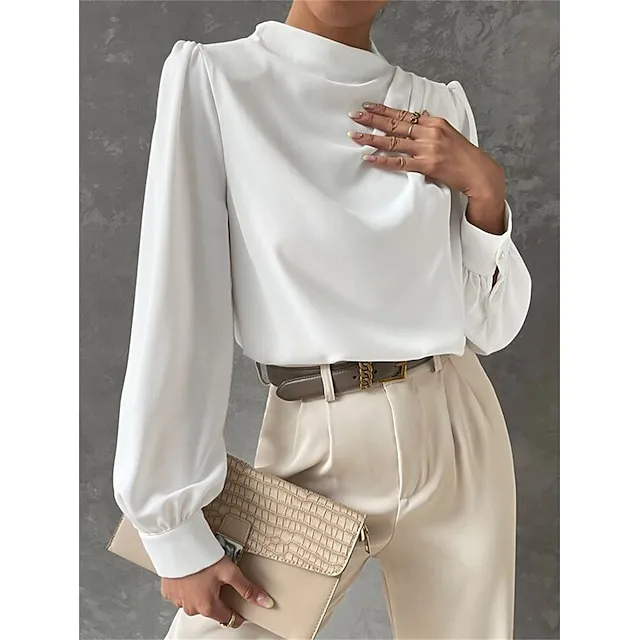 Women’s Shirt Blouse Satin Plain Work White Blue Long Sleeve Fashion Round Neck Regular Fit Spring & Fall