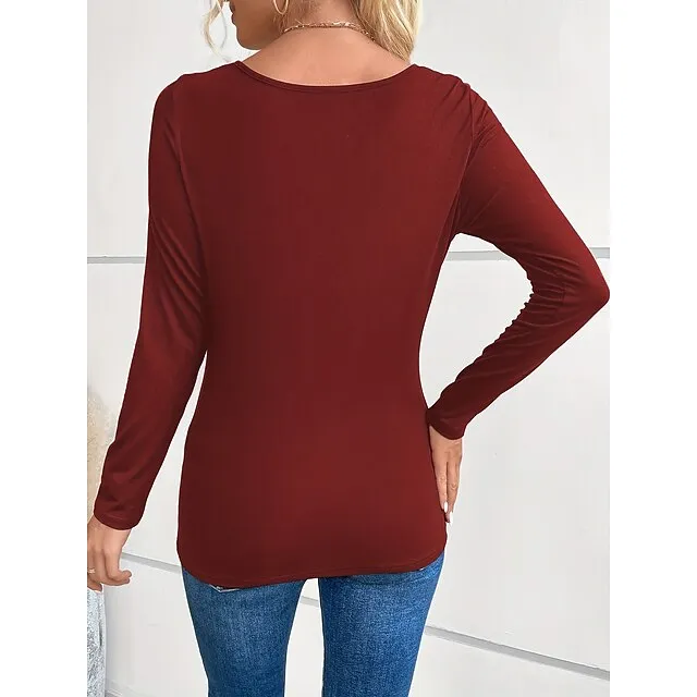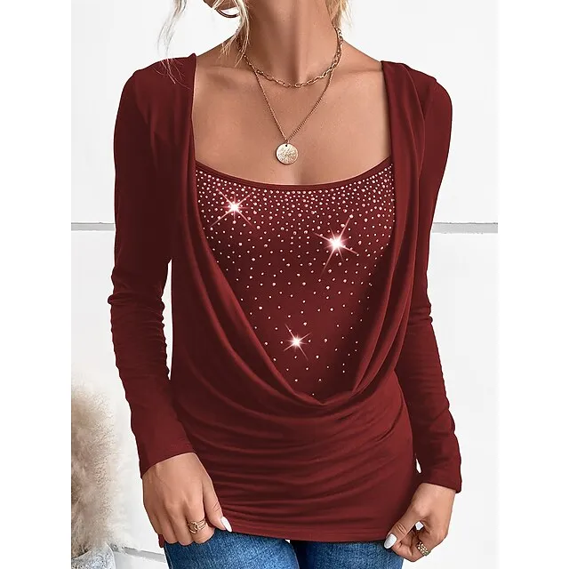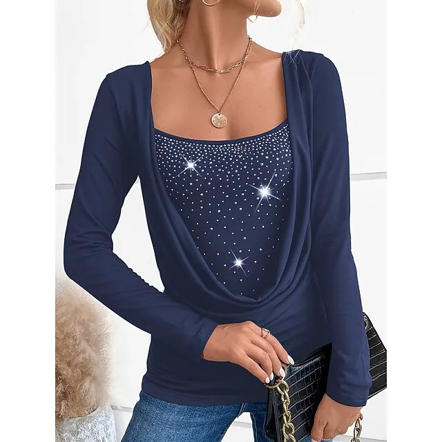 Women’s Shirt Blouse Sparkly Party Casual Black Wine Blue Rhinestone Long Sleeve Fashion Round Neck Regular Fit Spring & Fall