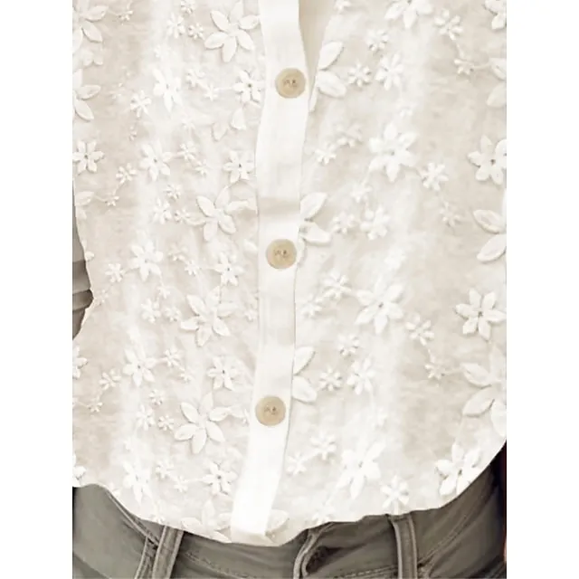 Women’s Shirt Cotton Linen Plain Casual White Lace Patchwork Embroidered 3/4 Length Sleeve Basic Beach Shirt Collar Regular Fit Summer Spring