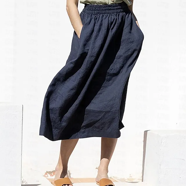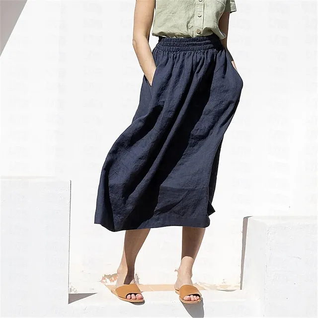Women’s Skirt A Line Midi Linen Navy Blue Khaki Skirts Summer Pocket Basic Casual Casual Daily Weekend S M L