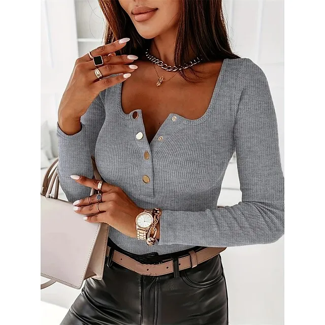 Women’s T shirt Tee Henley Shirt Cotton Textured Plain Daily Weekend Black Pink Red Button Long Sleeve Fashion U Neck Slim Spring & Fall