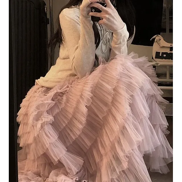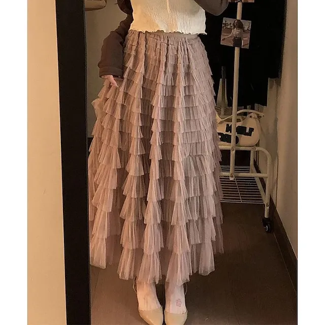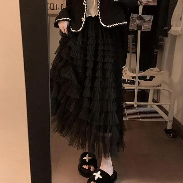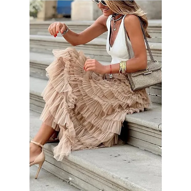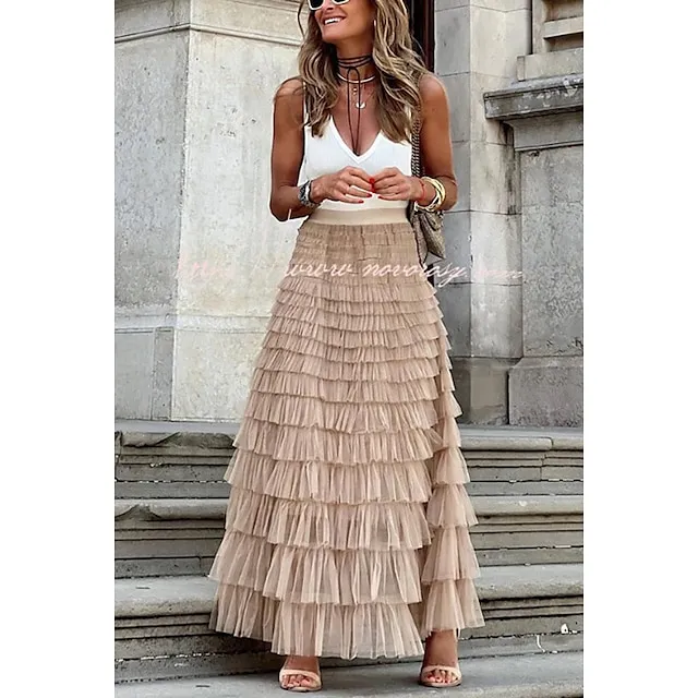 Women’s Trumpet / Mermaid Long Skirt Maxi Polyester Tulle Black White Pink Khaki Skirts Spring & Summer Ruffle Tulle Summer Vacation Casual Daily M L XL