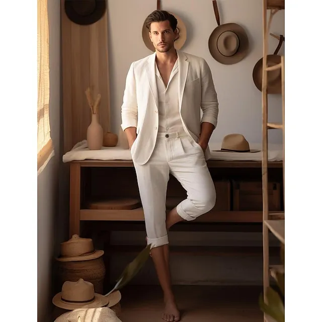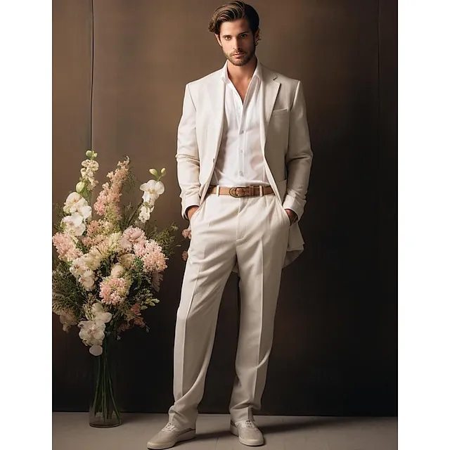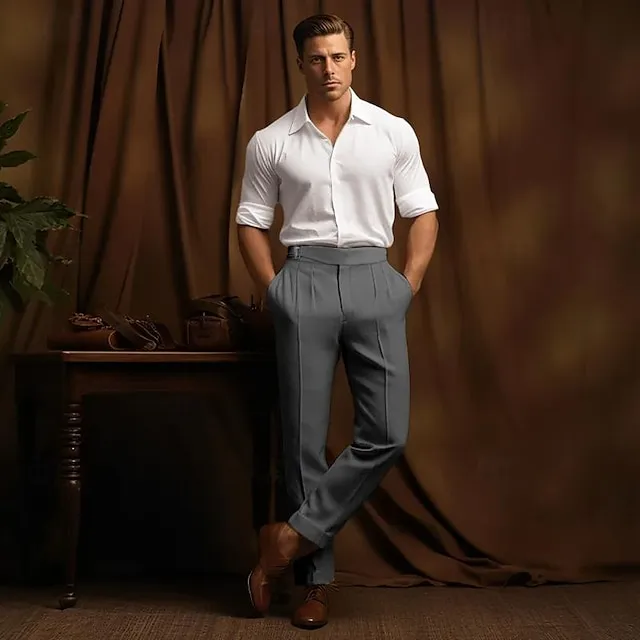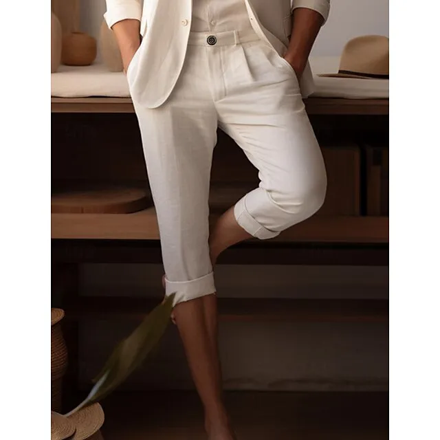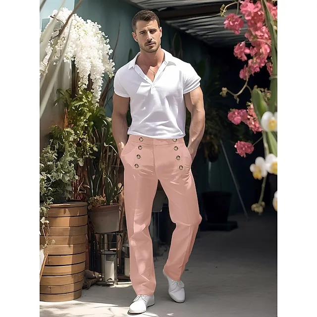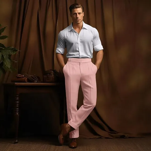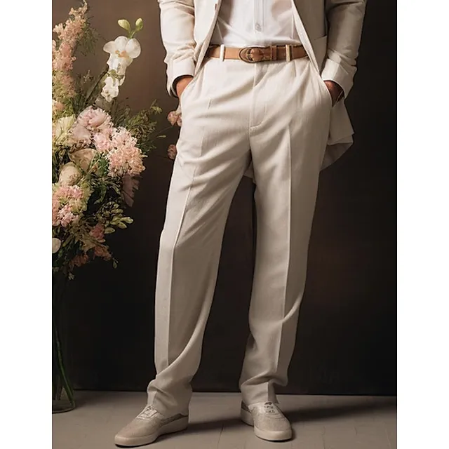40% Linen Men’s Linen Pants Trousers Summer Pants Pleated Pants Pocket Pleats Straight Leg Plain Breathable Comfortable Office / Career Daily Vacation Classic Casual White Pink