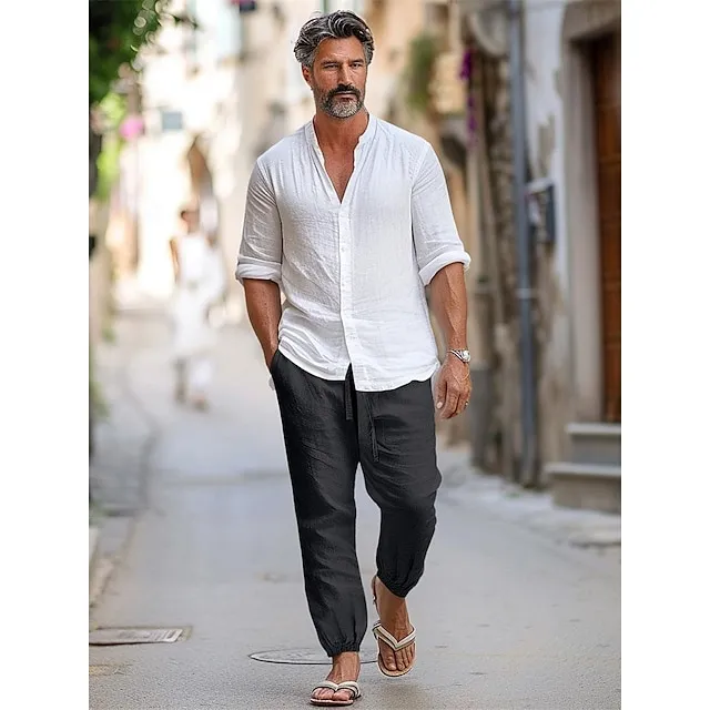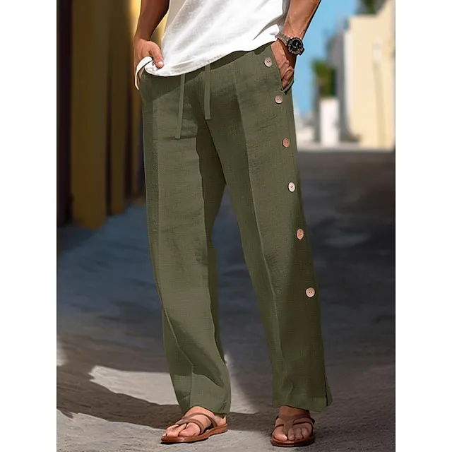 40% Linen Men’s Linen Pants Trousers Summer Pants Drawstring Elastic Waist Side Button Plain Breathable Comfortable Office / Career Daily Vacation Classic Casual Black White