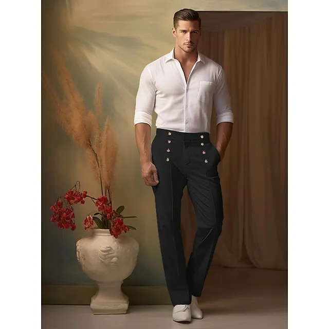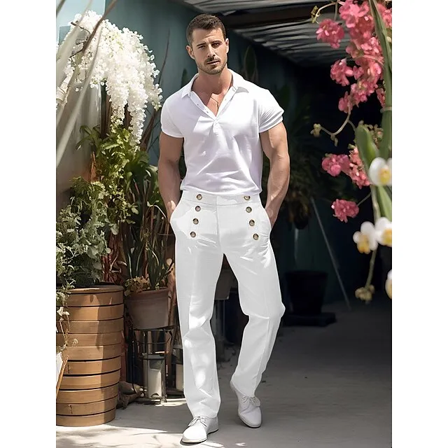 40% Linen Men’s Linen Pants Trousers Summer Pants Button Pocket Straight Leg Plain Breathable Comfortable Office / Career Daily Vacation Classic Casual Black White