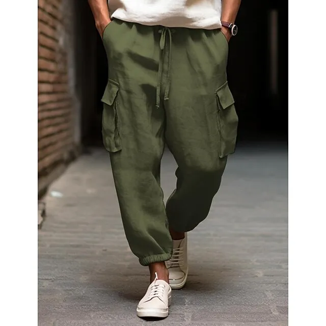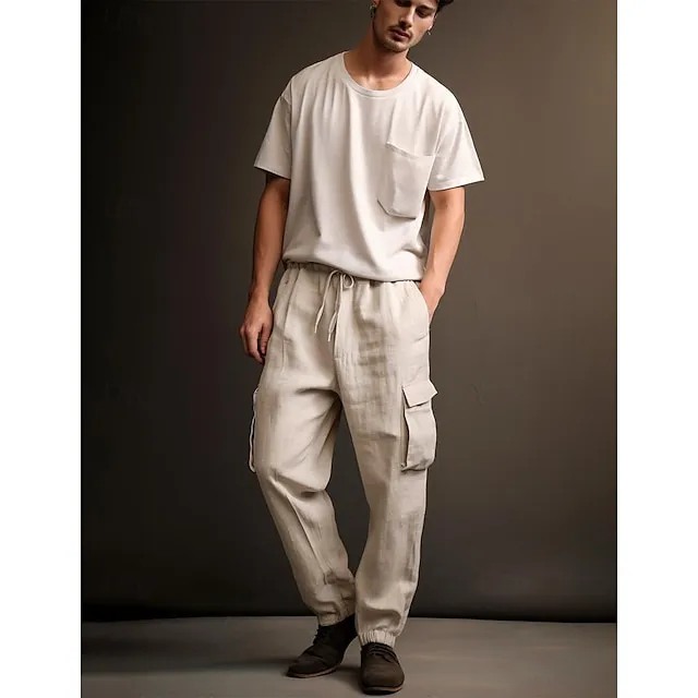 40% Linen Men’s Linen Pants Trousers Summer Pants Pocket Drawstring Elastic Waist Plain Breathable Comfortable Daily Vacation Going out Classic Casual Black White