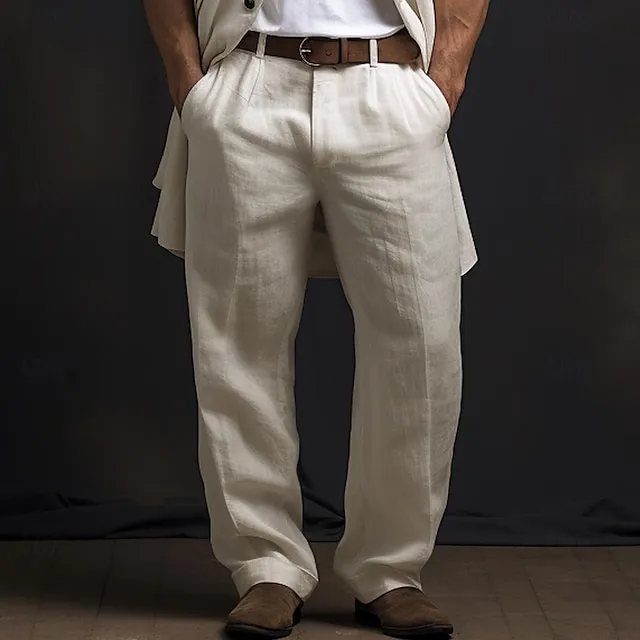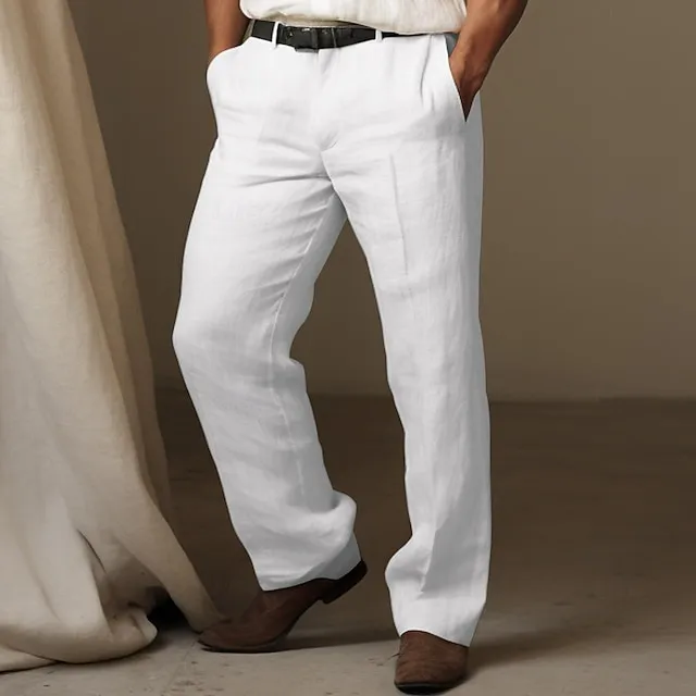 40% Linen Men’s Linen Pants Trousers Summer Pants Pocket Straight Leg Plain Breathable Comfortable Office / Career Daily Vacation Classic Casual Black White
