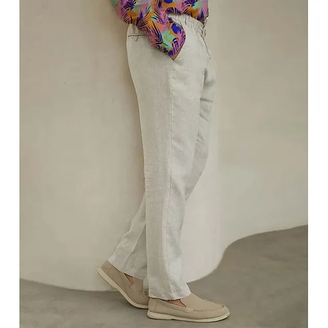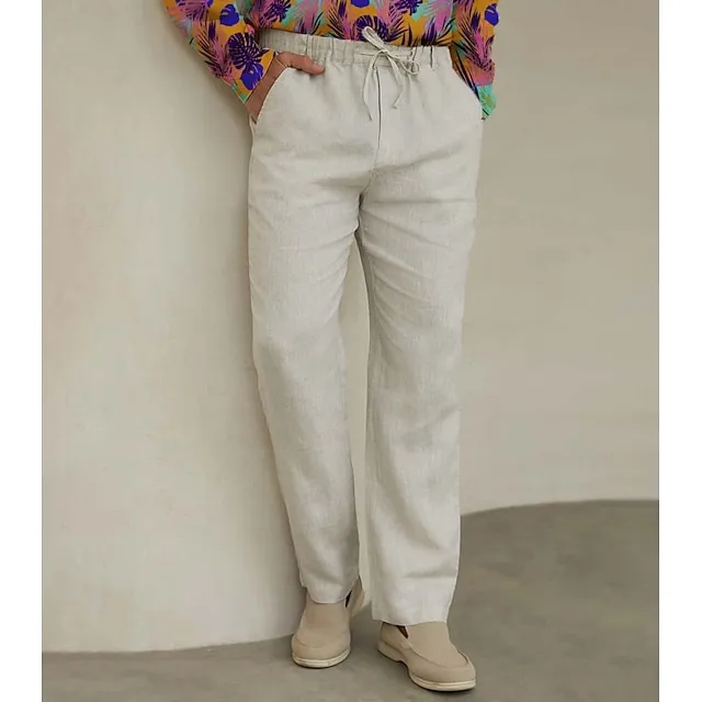 100% Linen Men’s Linen Pants Trousers Drawstring Elastic Waist Straight Leg Plain Comfort Breathable Casual Daily Holiday Fashion Classic Style Beige