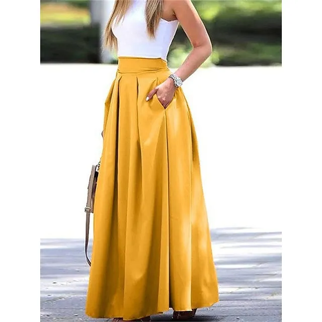 Women’s Skirt A Line Swing Long Skirt Maxi Polyester Black Yellow Red Skirts Spring & Summer Pleated Pocket High Waist Fashion Casual Street Daily S M L