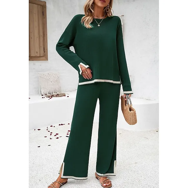 Shirt Pants Sets Women’s Black Brown Green Plain Split Casual Daily Fashion Round Neck Regular Fit S