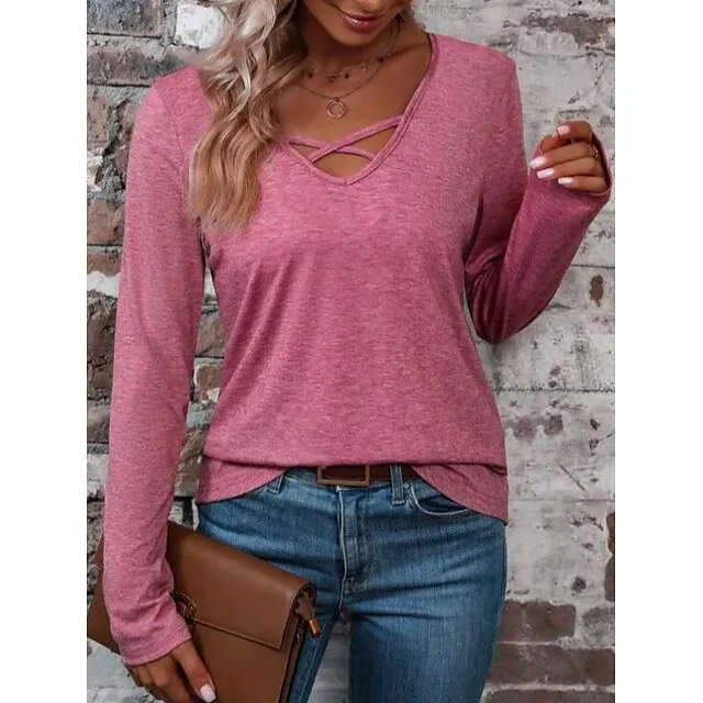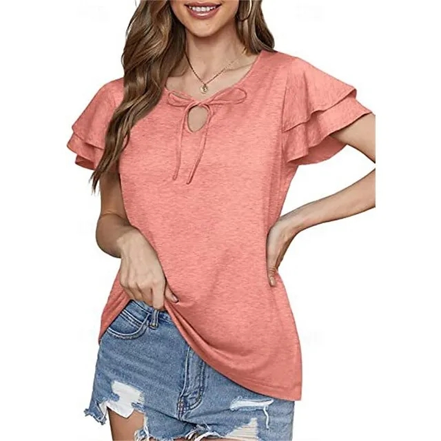 T shirt Tee Women’s Black Pink Blue Solid Color Lace up Ruffle Street Daily Fashion V Neck S