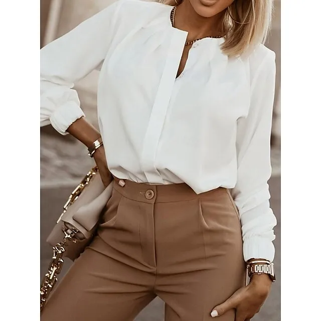 Shirt Blouse Women’s Black White Wine Solid Color Button Street Daily Fashion V Neck S