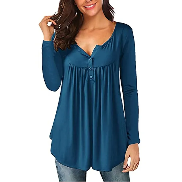 Shirt Blouse Women’s Blue Solid Color Button Daily Daily Round Neck Regular Fit S