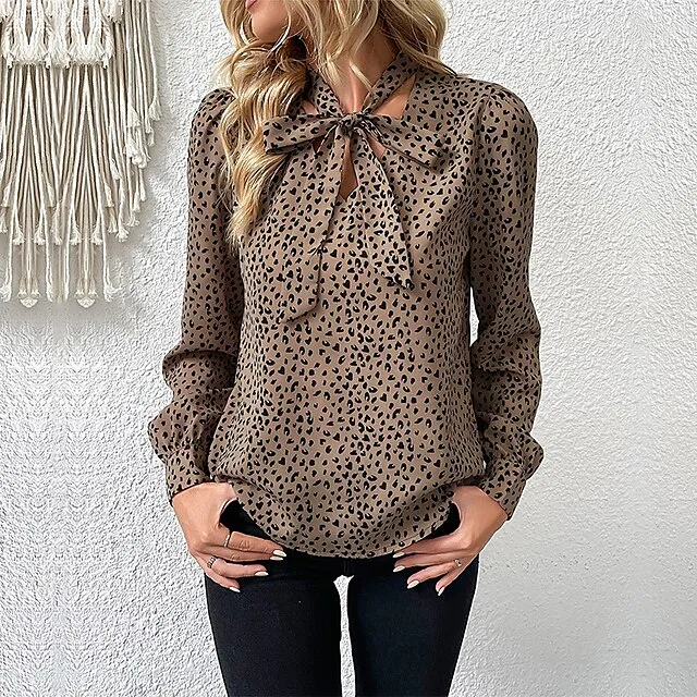 Shirt Blouse Women’s Khaki Leopard Print Lace up Printing Street Daily Fashion Daily V Neck Regular Fit S