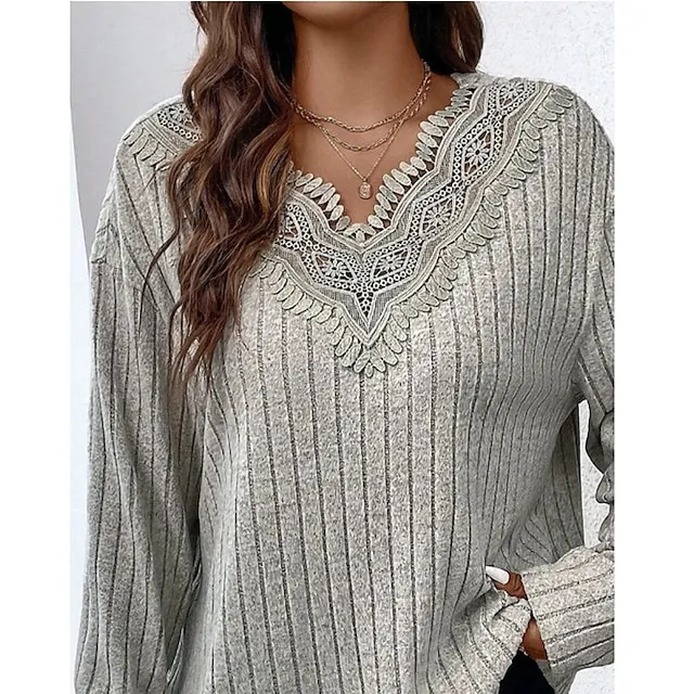 Shirt Blouse Women’s Gray Solid Color Lace Street Daily Fashion Daily V Neck Regular Fit XL