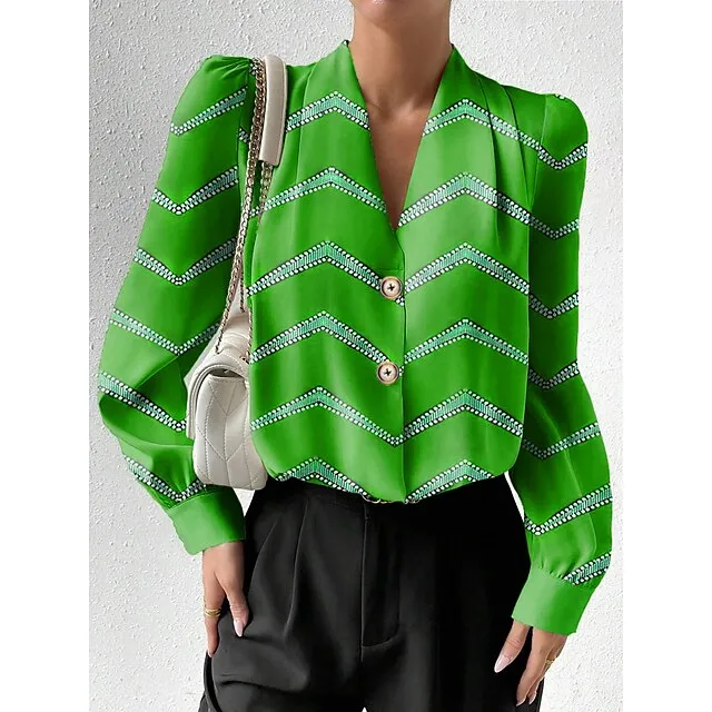 Women’s Shirt Blouse Striped Casual Light Green Pink Red Print Button Long Sleeve Fashion V Neck Regular Fit Spring & Fall