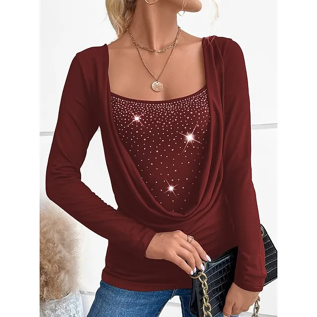 Women’s Shirt Blouse Sparkly Party Casual Black Wine Blue Rhinestone Long Sleeve Fashion Round Neck Regular Fit Spring & Fall