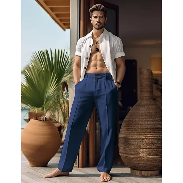 40% Linen Men’s Linen Pants Trousers Summer Pants Button Pocket Straight Leg Plain Breathable Comfortable Office / Career Daily Vacation Classic Casual Black White