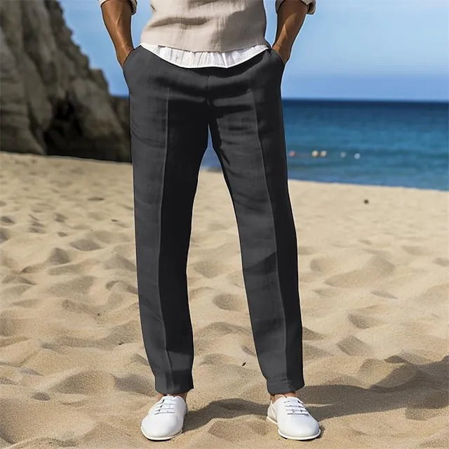40% Linen Men’s Linen Pants Trousers Summer Pants Pocket Elastic Waist Straight Leg Plain Breathable Comfortable Office / Career Daily Vacation Classic Casual Black White