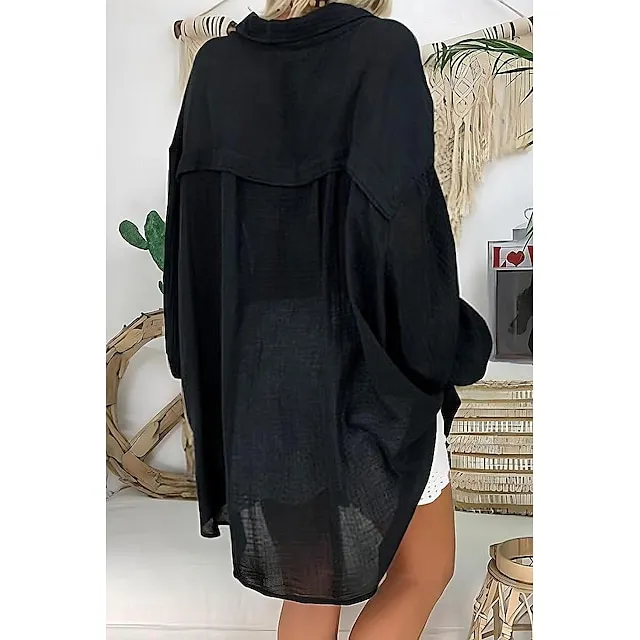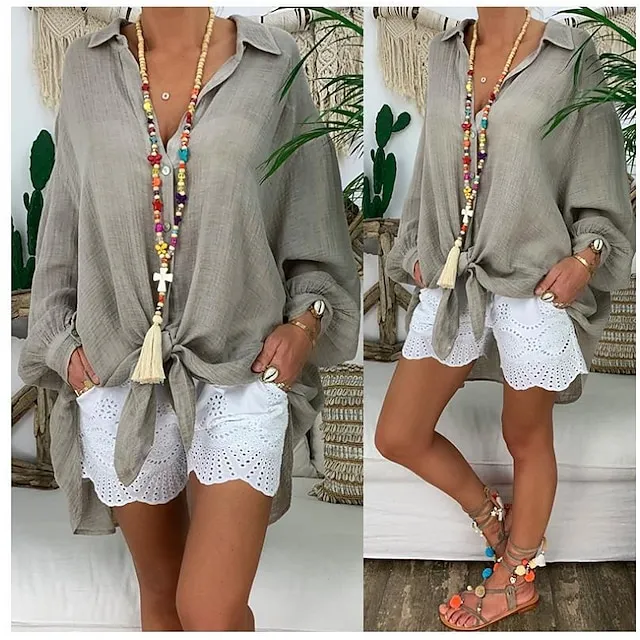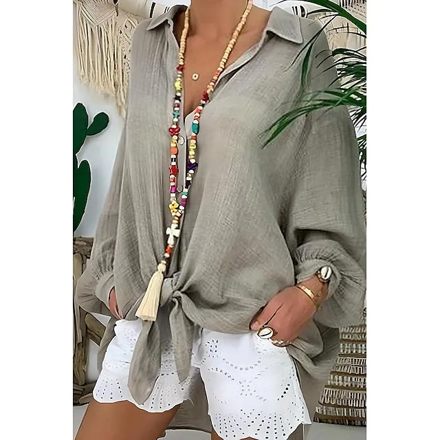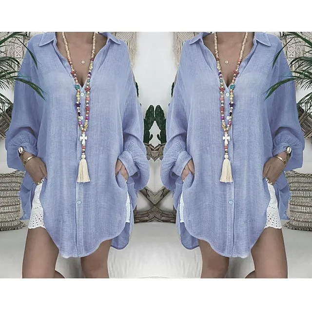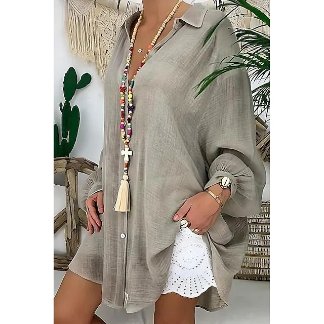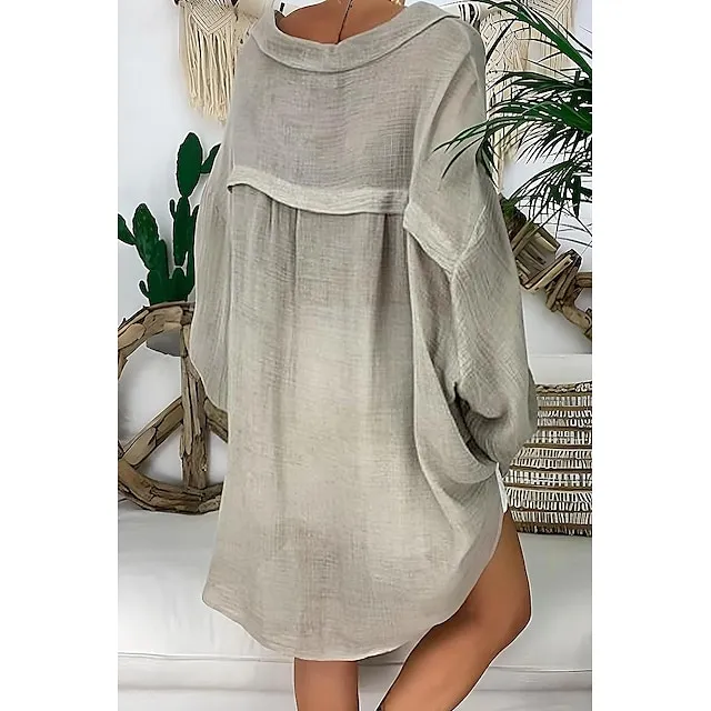 Linen Shirt Shirt Tunic Shirts Blouse Women’s Black White Blue Solid Color Button Long Street Daily Fashion Shirt Collar Cotton Linen Regular Fit S