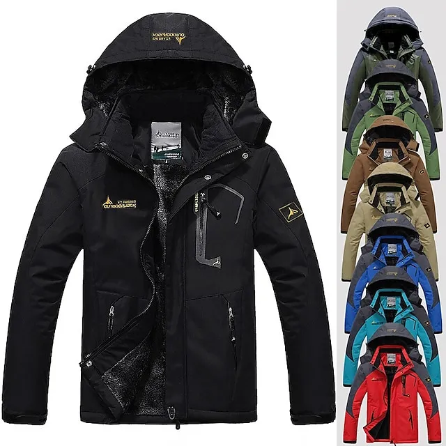 Men’s Hoodie Jacket Waterproof Rain Jacket Ski Jacket Fleece Jacket Winter Outdoor Solid Color Thermal Warm Waterproof Windproof Outerwear Windbreaker Coat Camping Hunting Ski / Snowboard Army Green