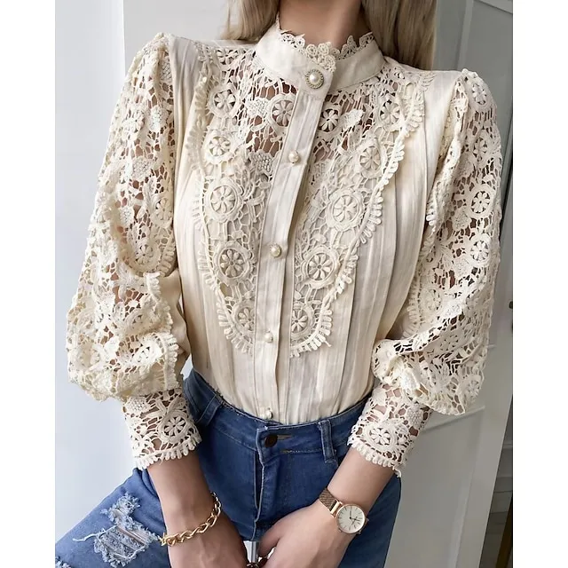 Women’s Lace Shirt Shirt Blouse Turtleneck shirt Plain Daily Weekend Black White Beige Lace Button Cut Out Long Sleeve Elegant Vintage Fashion Standing Collar Regular Fit Spring Fall